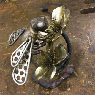 Sculpture d'une abeille fabriquée en inox, les couleurs proviennent de la chauffe d'un chalumeau.